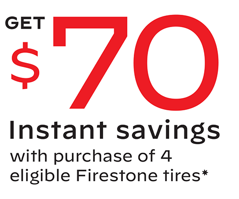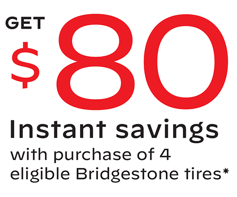 *Receive $80 off 4 eligible Bridgestone tires or $70 off 4 eligible Firestone tires purchased between January 1 – February 28, 2026. Limit 2 per household. Participating authorized retailers only. Void where prohibited. Other restrictions, fees, and taxes may apply. Discount given at time of purchase and is on pretax amount. See store associate for details.